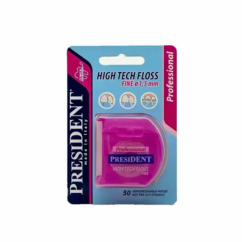 President Professional High Tech Fine Floss هو خيط أسنان مرن يحتوي على منطقة إسفنجية تعمل على إزالة الأوساخ والبلاك من بين الأسنان.