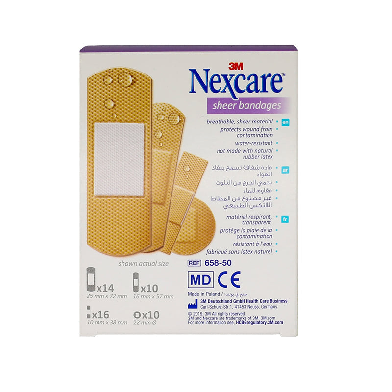 ضمادات Nexcare Sheer معقمة، قابلة للتنفس، ومرنة مصنوعة من مواد شفافة تحمي من الجراثيم والتهابات الجلد.
