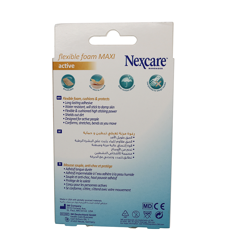 لصقات فوم نيكسكير أكتيف فليكسبل مصممة للأشخاص النشطين مع حماية بزاوية 360 درجة تحمي من الأوساخ وتلتصق بالبشرة الرطبة.