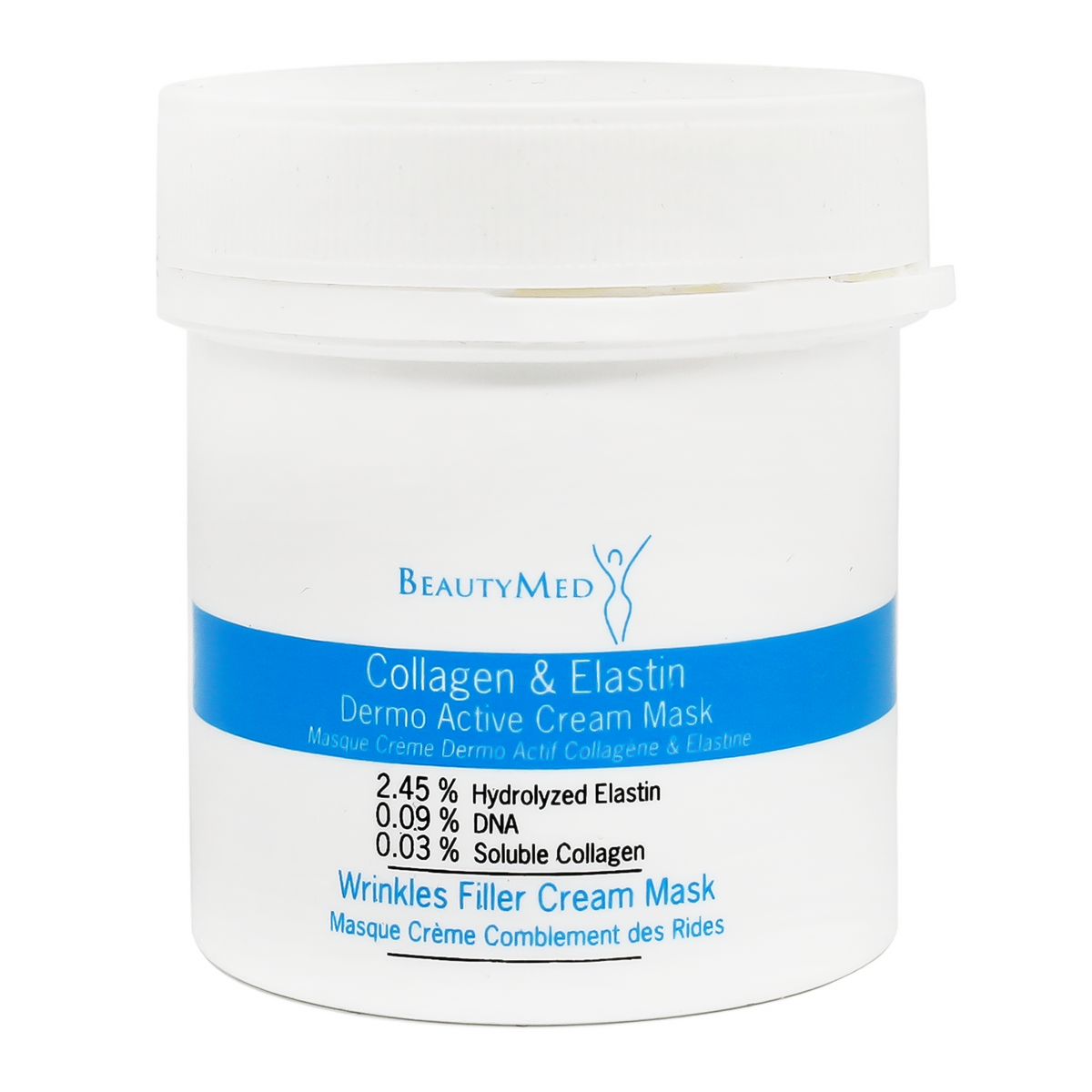 قناع كريم الكولاجين والإيلاستين ديرمو أكتيف من BeautyMed يساعد على تحسين مرونة الجلد وإبطاء عملية شيخوخة الجلد بشكل كبير من خلال تعزيز تخليق الكولاجين، ترطيب الجلد، وتقوية الحاجز الخلوي.