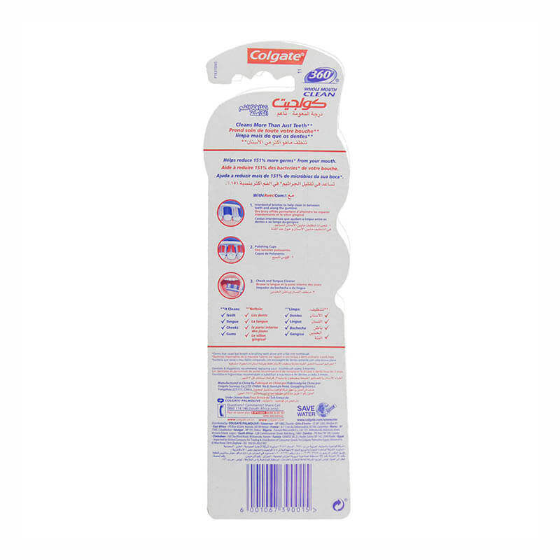 فرشاة أسنان كولجيت 360 لتنظيف الفم بالكامل تحتوي على كوب تلميع ومنظف للخدين واللسان لضمان نظافة الفم وإزالة البكتيريا المسببة للرائحة.