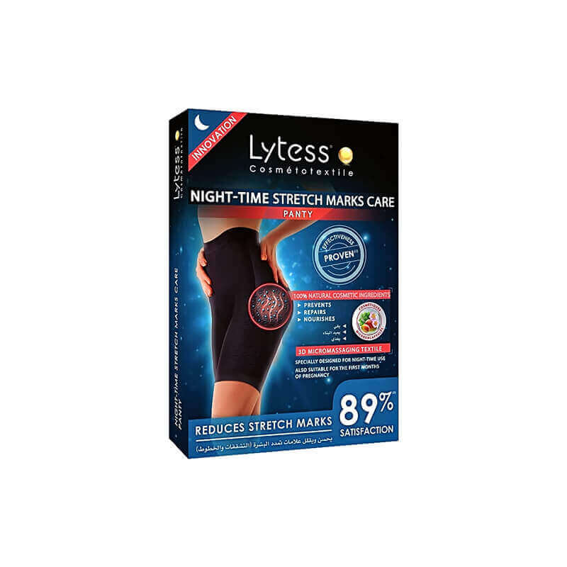 يتم إطلاق المكونات النشطة في سراويل العناية بعلامات التمدد الليلية من Lytess تدريجياً في الجلد أثناء الليل لعلاج علامات التمدد على البطن، الوركين، الأرداف، والفخذين.