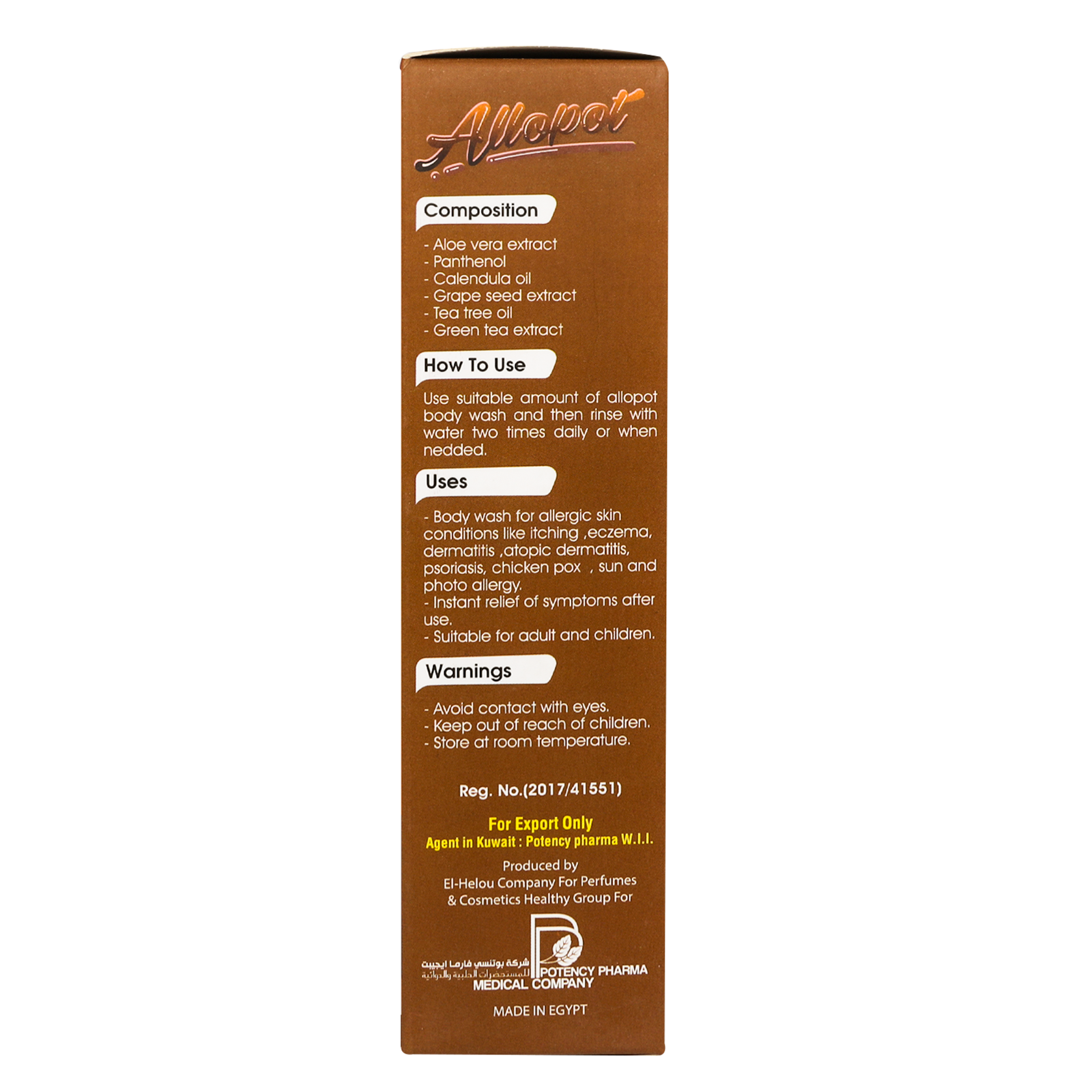 Allopot Anti-Allergy body wash derivatives from natural ingredients, that work by blocking the effects of a certain natural substance (histamine) that irritates the skin.