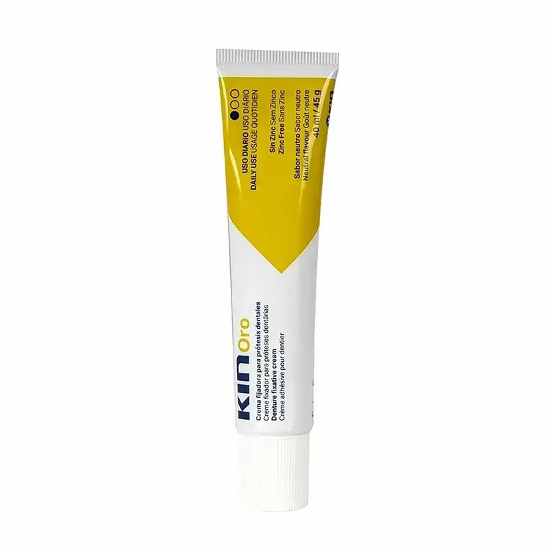 Kin Oro Denture Fixative Cream is a glue or adhesive that keeps dentures secure and in place throughout the day.