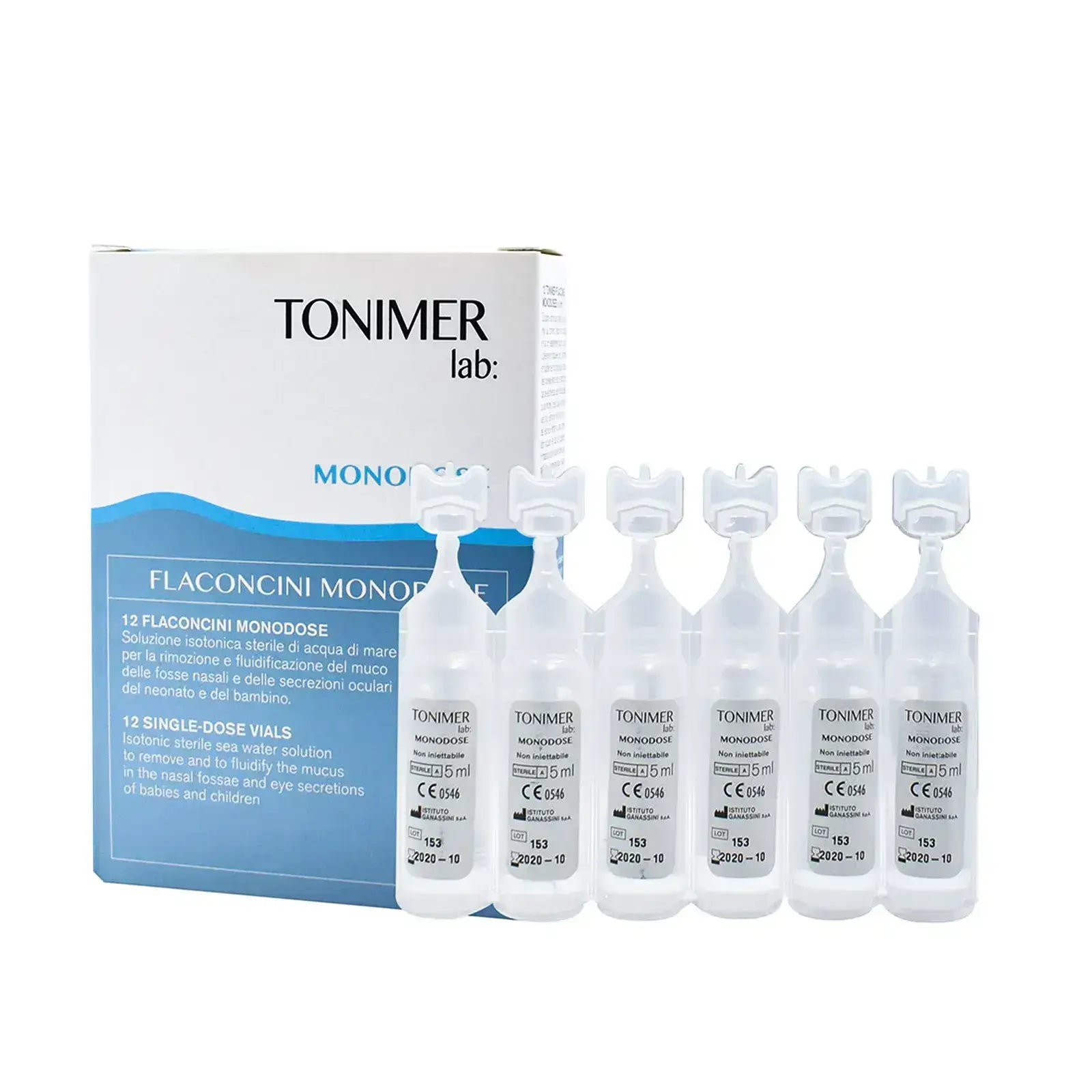 Tonimer Lab Single-dose vials Solution isotonic sterile seawater, reduced sodium content and a slightly alkaline pH, particularly suitable for fluidization and removal of the mucus in nasal cavities of infants and children in cases of dryness of mucous membranes and colds.